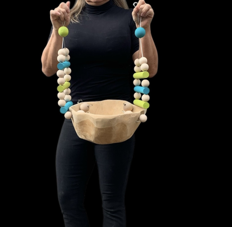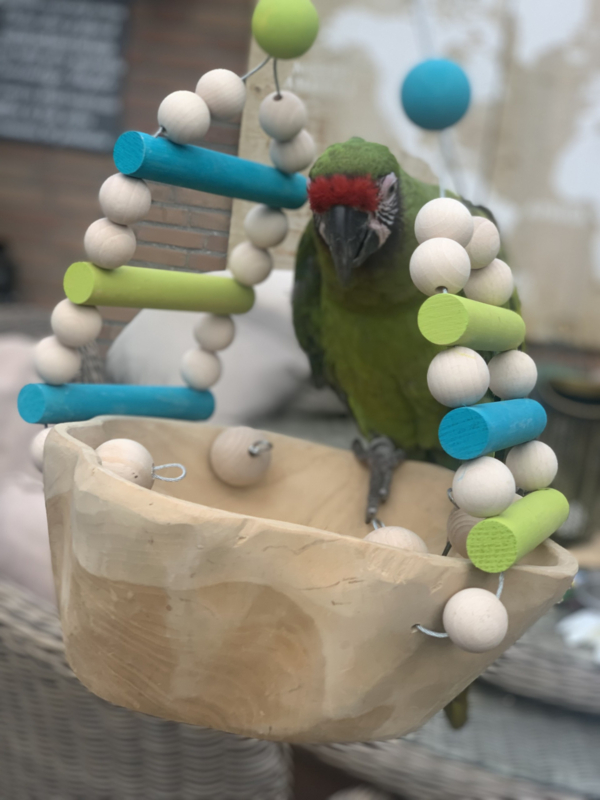 De stevige constructie van staaldraad en beukenhouten ballen geeft niet alleen een natuurlijke uitstraling, maar zorgt ook voor minder voerverspilling en rommel buiten de bak.
