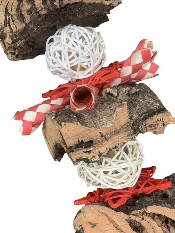 Gemaakt van hoogwaardige materialen zoals kurk, bukkelhout, rotan en kleurrijke kralen. Perfect om te knagen, trekken, slopen en ontdekken.