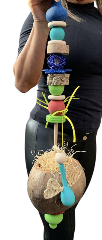 Artikelnummer: 4805388768995 OverzichtDe Mega Grote Coconut Schaal is een robuust en natuurlijk vogelspeeltje, bevestigd op een stevige stok en versierd met diverse natuurlijke materialen. Deze grote kokosnootschaal biedt niet alleen veel sloop- en speelplezier, maar is ook ideaal om voer of snacks in te verstoppen. Zo stimuleer je het natuurlijke zoek- en foerageergedrag van je vogel.